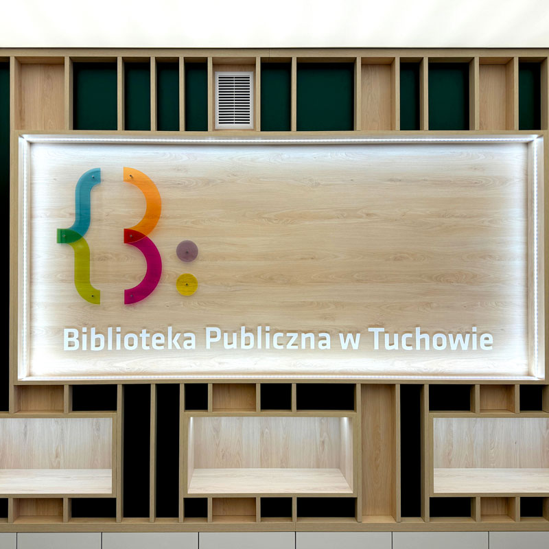 Dla Biblioteki w Tuchowie zaprojektowaliśmy i wykonaliśmy kompleksowy system oznakowania, który łączy funkcjonalność z estetyką i nowoczesnym wzornictwem. Zadbaliśmy o każdy detal – od pierwszego kontaktu z budynkiem, aż po subtelne elementy wewnętrznego oznakowania i dekoracji inspirowanej światem literatury.