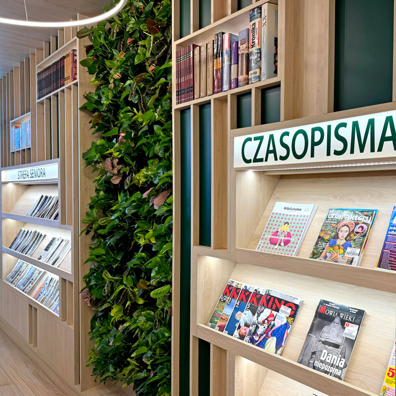 - Napisy na regałach – ułatwiające orientację w księgozbiorze